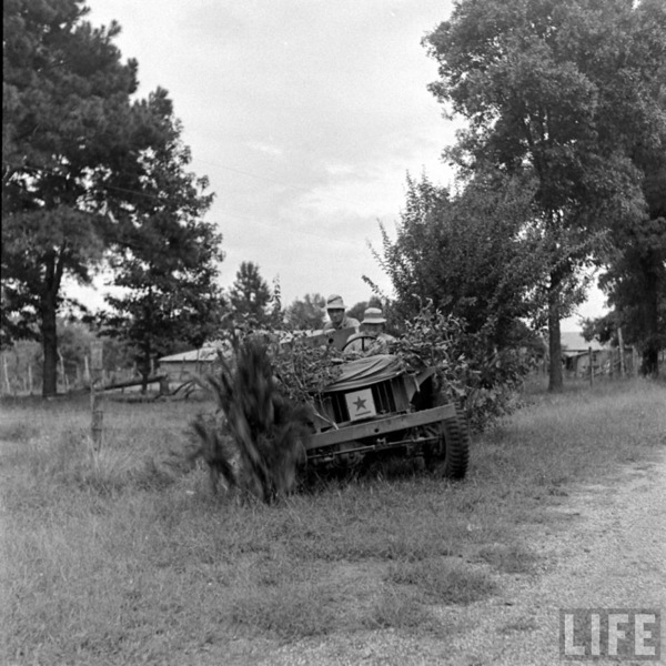 Singer Shirley Lloyd riding in an Army jeep on the way to a USO show. Fort Benning, GA, US. 1942. Photographer: William C. Shrout. SOURCE: LIFE