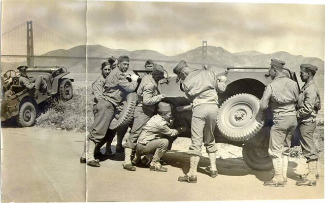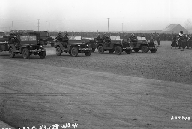 This photo shows an array of Willys MA jeeps in San Francisco during World War II, with the Golden Gate Bridge in the background. The original caption of this photo gives a date of 1945. (Source: Olive-Drab)