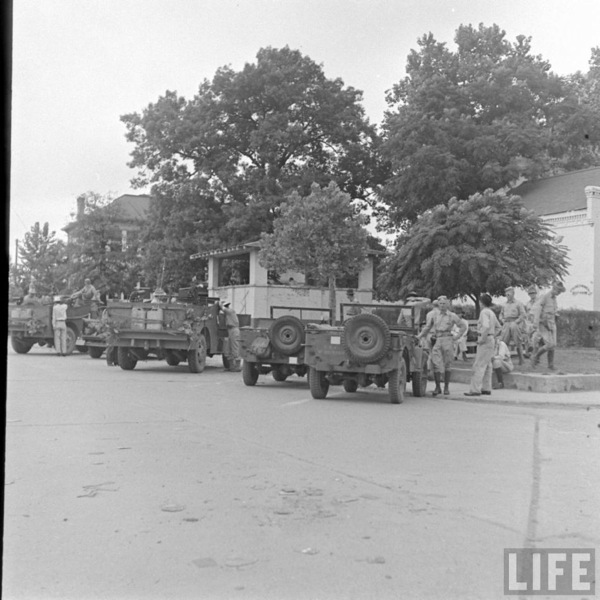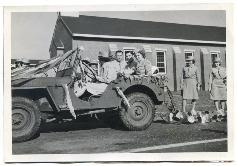 Singer Shirley Lloyd riding in an Army jeep on the way to a USO show. Fort Benning, GA, US. 1942. Photographer: William C. Shrout. SOURCE: LIFE