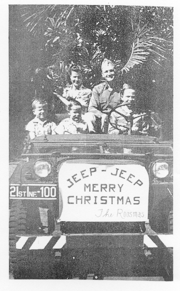 This photo was taken from Mrs. Roosma’s memoirs, Recollections and Reflections of an Army Wife, 1926-1956 (1978), at the US Army Military History Institute, Carlisle Barracks, PA. Photo is of a Christmas cards made, a picture of all of us including Pombo, sitting in one of the new jeeps, made in middle of November, just before the Pearl Harbor attack. 21st Inf in Hawaii