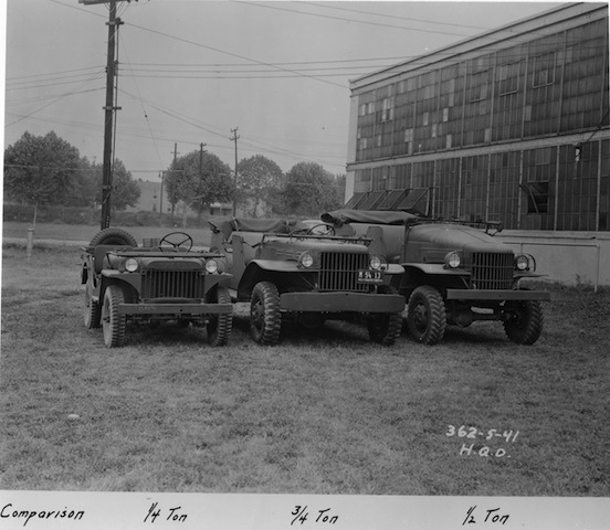 Truck, 1/4 Ton, 4x4 Willys MA (left), Truck, Command Reconnaissance, 3/4 Ton, 4x4 Dodge WC-56, and Truck, Radio, 1/2 Ton, 4x4 Dodge, 15 May 1941.